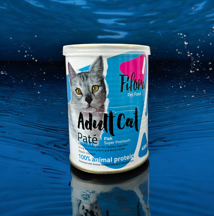 کنسرو پته طعم ماهی Fifora با وزن ۴۰۰ گرم، غذایی کامل، خوشطعم و مغذی برای گربههای بالغ تمام نژادهاست.