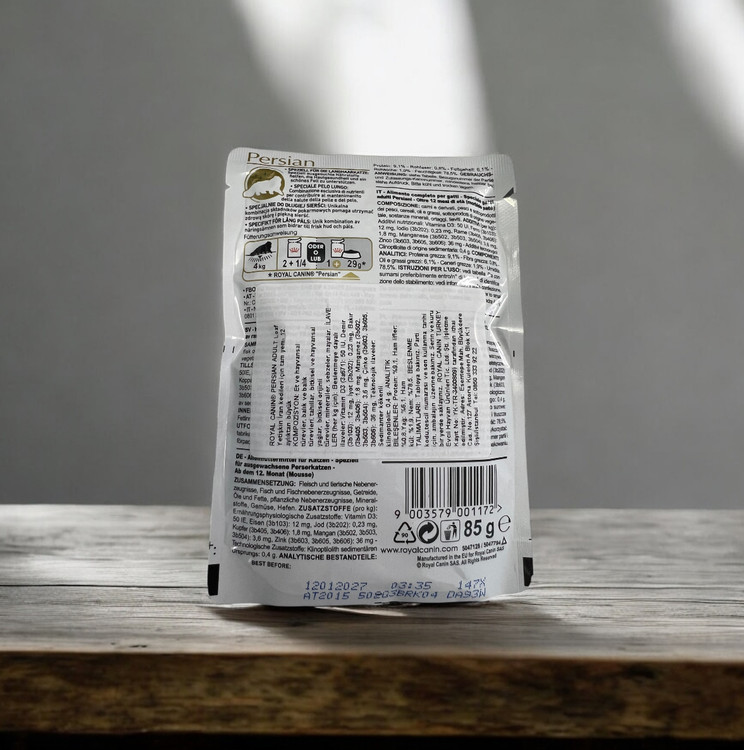 * تغذیه کامل و متعادل: این پوچ یک غذای کامل و متعادل برای گربههای پرشین بالغ (بالای یک سال) است و میتواند به تنهایی یا در کنار غذای خشک رویال کنین پرشین استفاده شود تا یک رژیم غذایی متنوع و جذاب برای گربهتان فراهم کند.