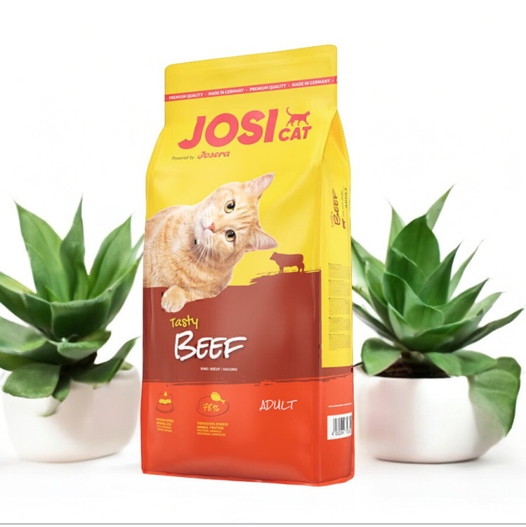 غذای جوسی کت طعم بیف (JosiCat Tasty Beef) یک غذای خشک کامل و متعادل است که توسط شرکت جوسرا (Josera) آلمان تولید میشود. این غذا برای گربههای بالغ (چه گربههایی که در داخل خانه زندگی میکنند و چه گربههایی که به فضای بیرون دسترسی دارند) طراحی شده است.