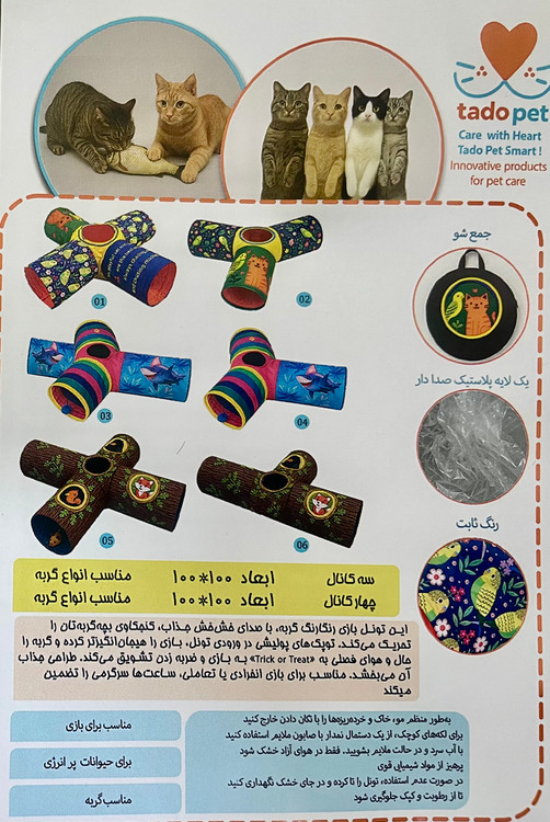 تونل بازی چهار کانال گربه تادو یک اسباببازی سرگرمکننده و تحرکمحور برای گربههاست که با طراحی چندمسیره، حس شکار و کنجکاوی طبیعی گربه را تحریک میکند.