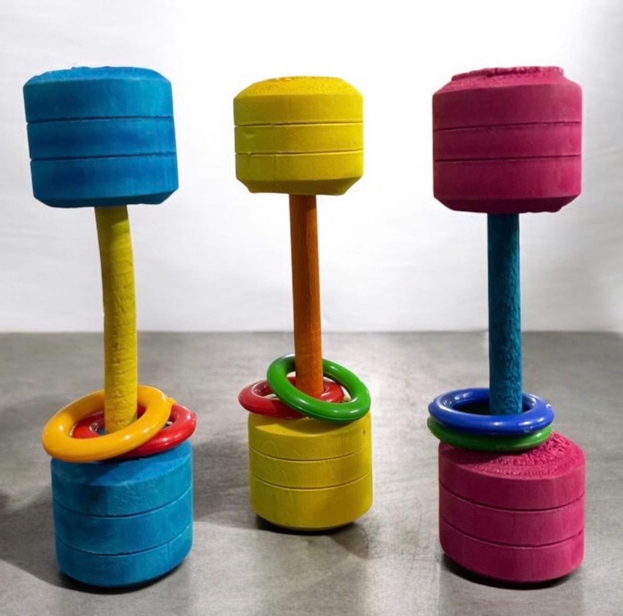 اسباب بازی چوبی طرح دمبلی با حلقه های پلاستیکی مخصوص طوطی سانان